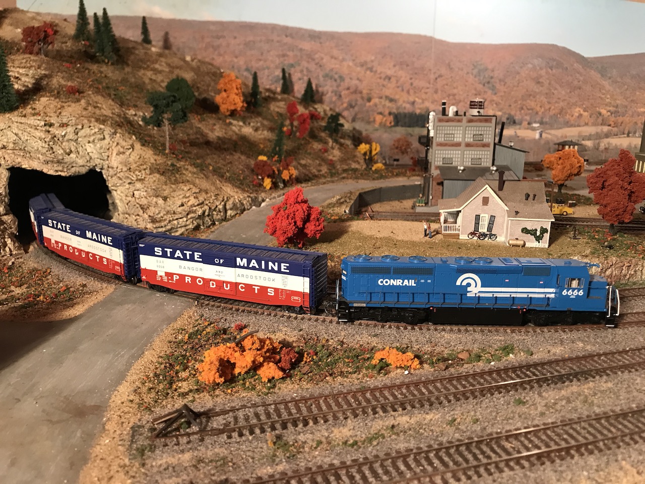 This client wanted a small double track railroad, featuring 2-3 trains operation, with fall season scenery and details.