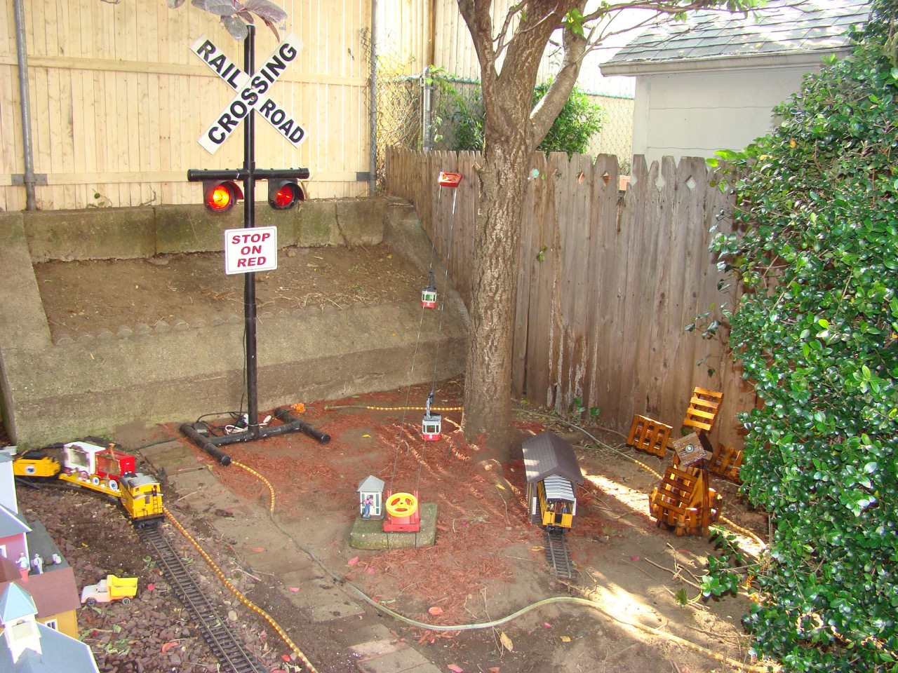 This client wanted a simple garden railroad in his backyard. Layout features some Aristocraft, LGB, Peco and custom made structures plus an operating Rigi Duo cable cars!