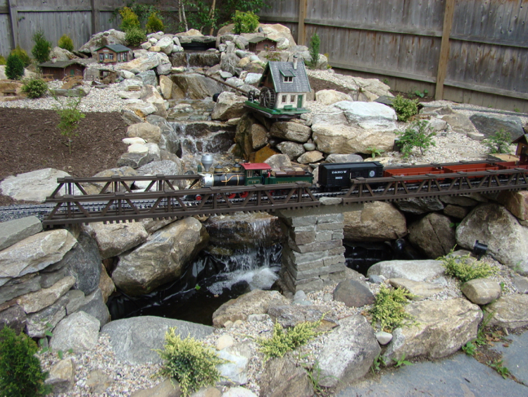 This client wanted a nice garden layout for him and his wife to operate. Features two operating waterfalls and accessories!